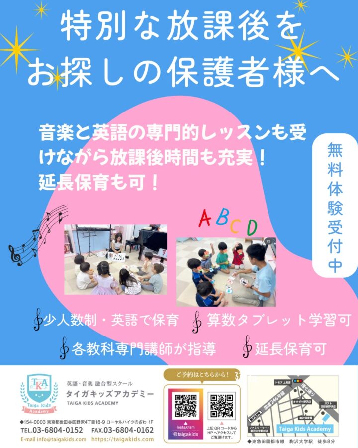 公的学童に通ながらも当校で、週に一度は本格的な音楽や英語のレッスンを受ける、そんな特別な放課後をお子さまに与えてあげませんか?